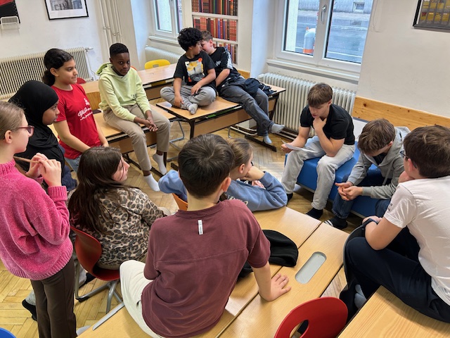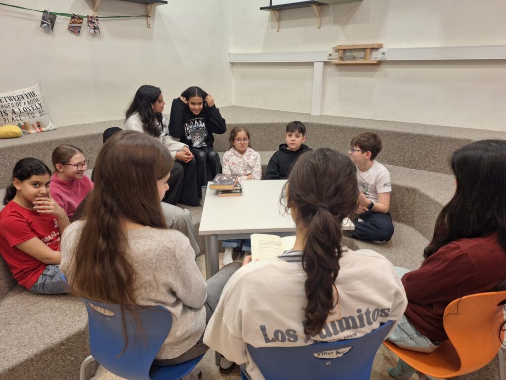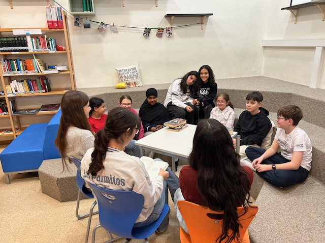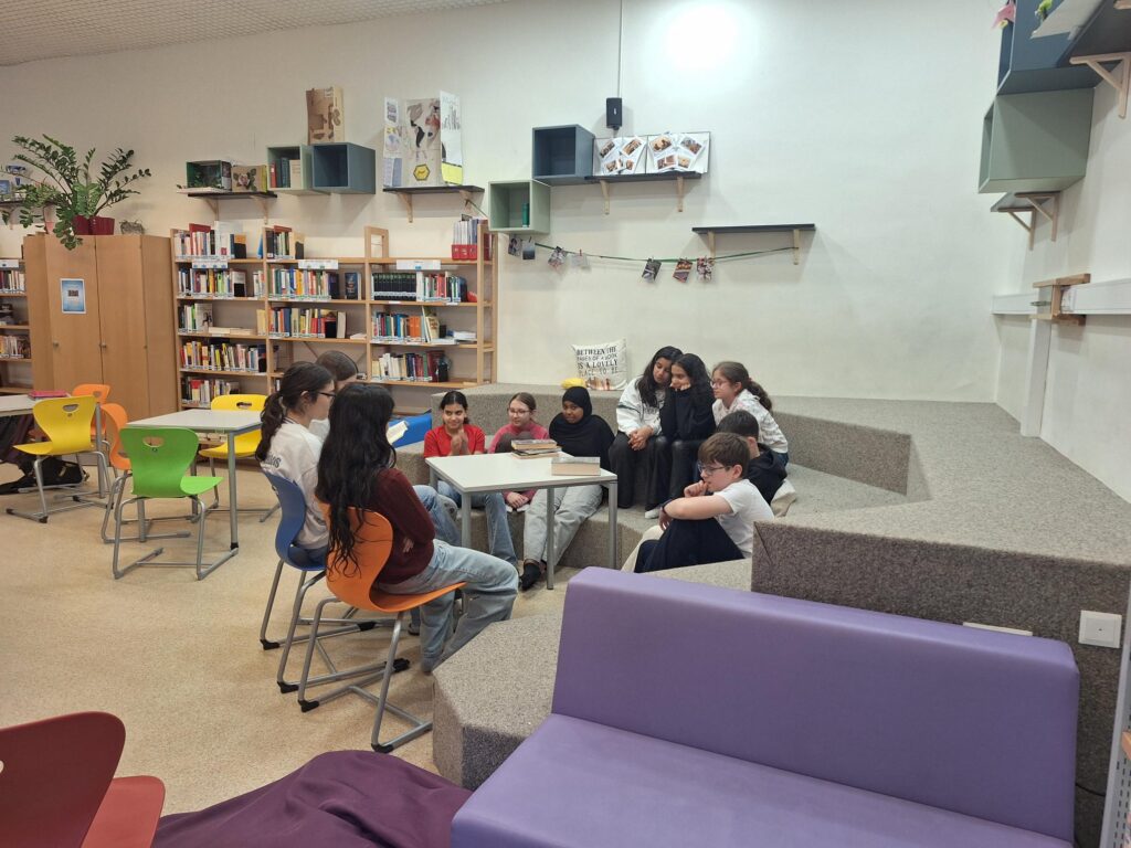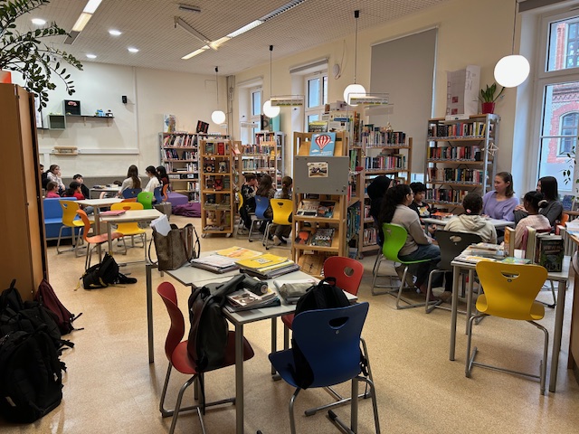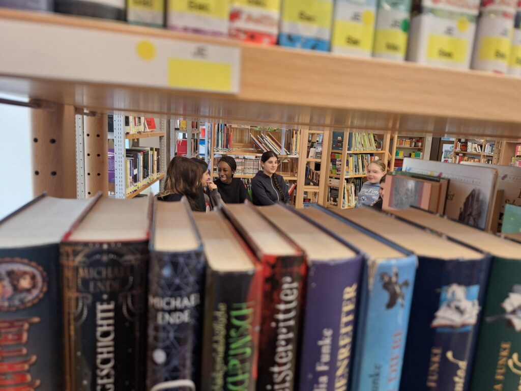 Dann wurde’s ernst – oder besser gesagt: richtig gut. Die 6C übernahm und las der 1A vor. In kleinen Gruppen wurde zwischen den Regalen gelesen, gelauscht und gelegentlich auch ein bisschen mitgefiebert. Die „Großen“? Überraschend professionell. Die „Kleinen“? Voll dabei. Genau so soll das laufen.